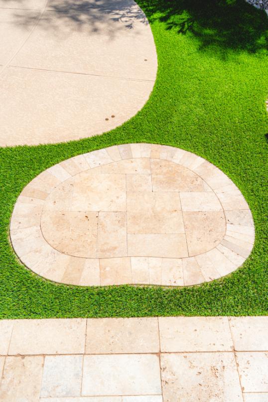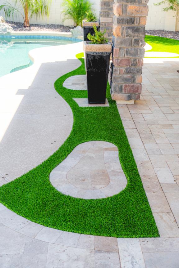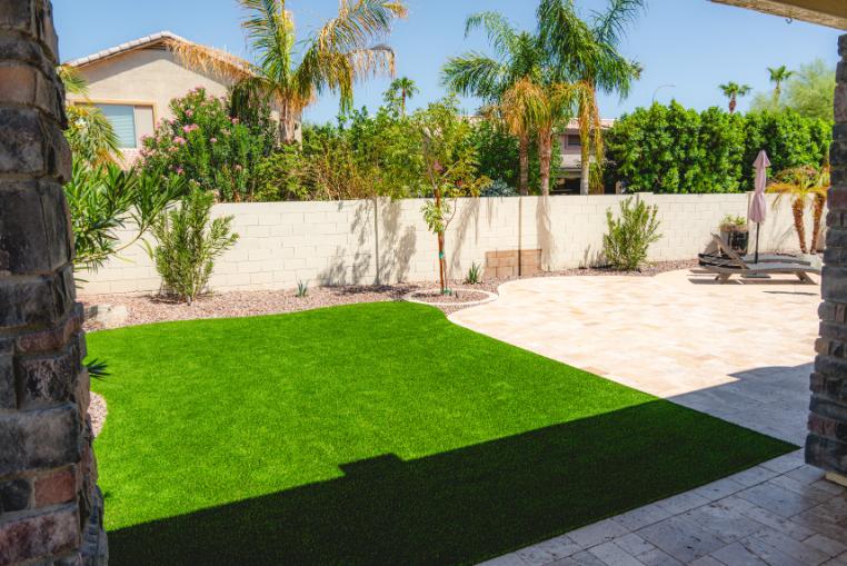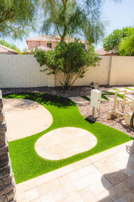 This project features lush artificial turf, custom hardscape elements, and strategically placed pathways that guide movement and create structure throughout the space. Carefully selected desert‑friendly plants complement the hardscape and add natural beauty without demanding excessive water or upkeep. Every design choice, from layout to materials to stonework, was made with the homeowner’s lifestyle in mind — ensuring the backyard is as functional as it is attractive.